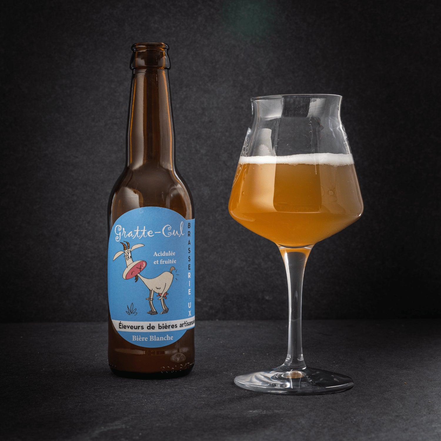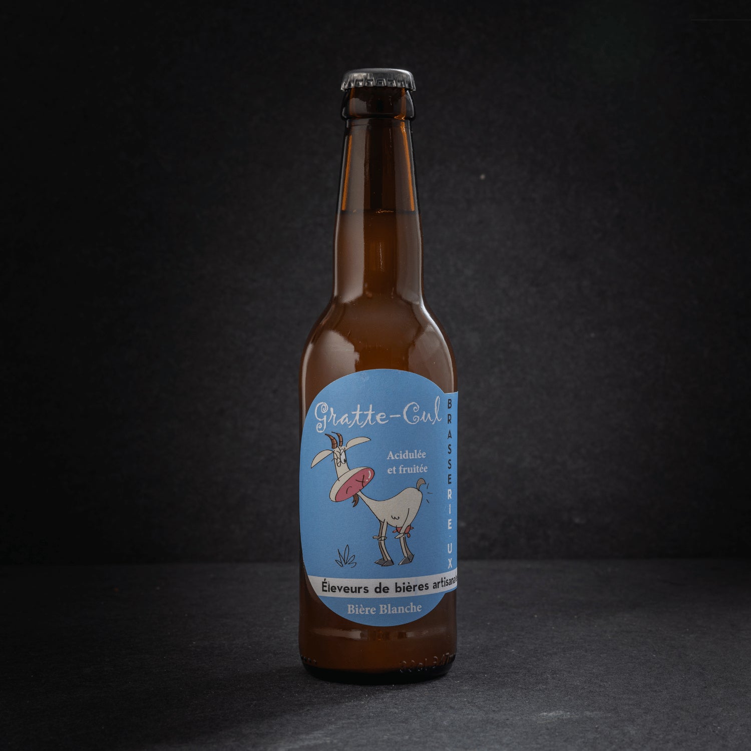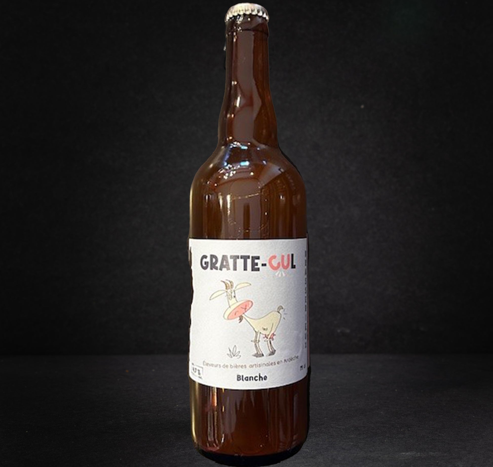 Weißbier ist würziger als ein helles Bier und zeichnet sich durch sein leicht milchiges Aussehen und seinen milden Geschmack aus. Das saure und fruchtige Bier Gratte-Cul erfüllt diese Kriterien perfekt und garantiert gleichzeitig Qualität durch die Verwendung von Zutaten, die hauptsächlich aus der Ardèche stammen: