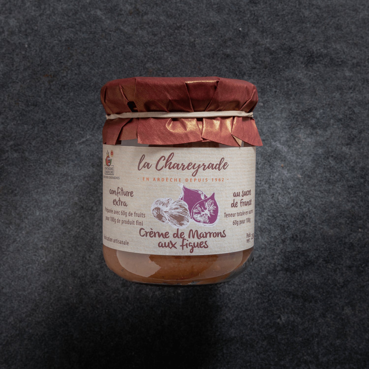 Kastanien, Feigen, französischer Zucker und Quellwasser aus den Ardèche-Bergen, das sind die Hauptzutaten unserer Kastaniencreme mit Feigen.