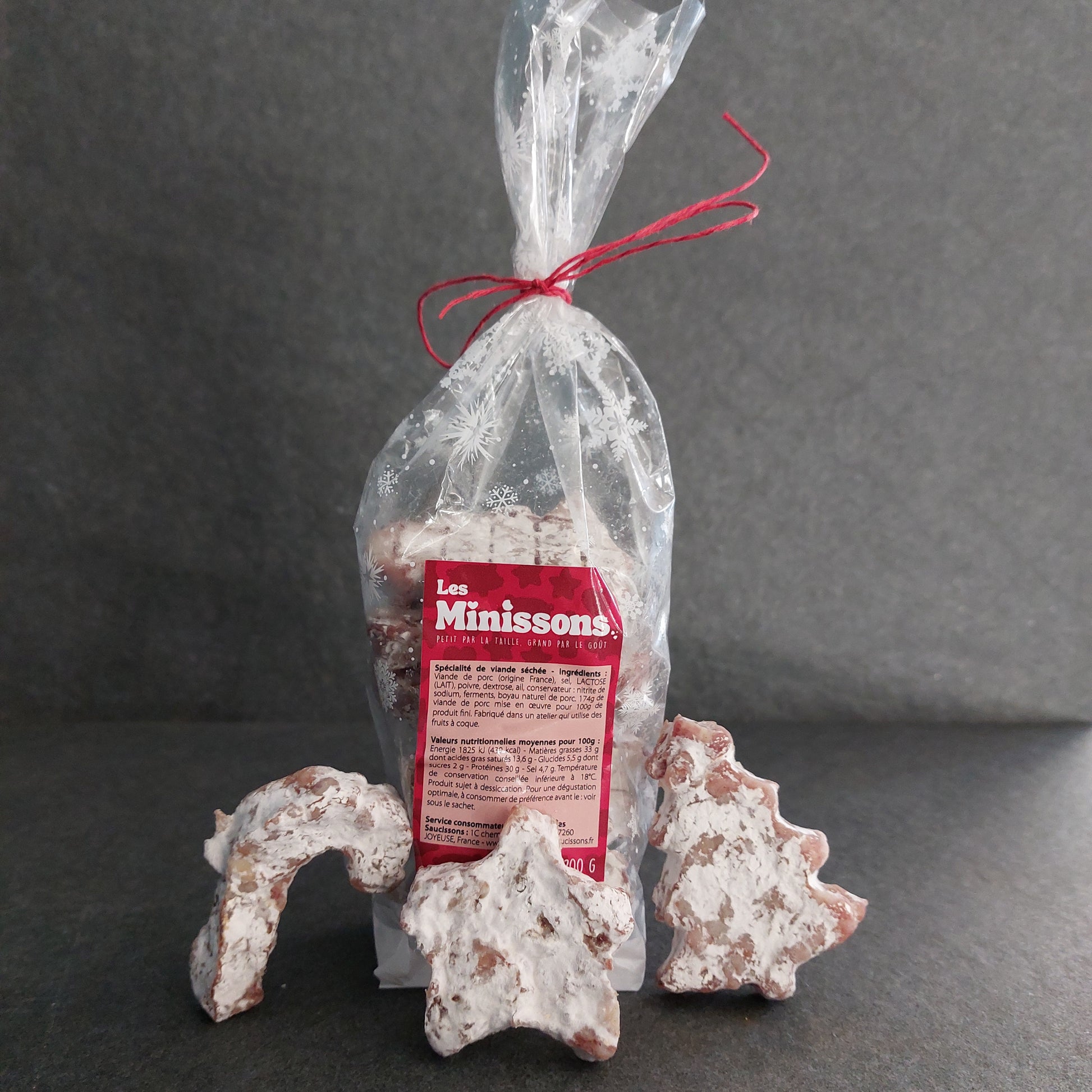 Découvrez notre nouveauté qui va transformer vos apéritifs : un sachet de 200 g de mini saucissons, déclinés dans des formes originales telles que l’étoile, le sapin, le sucre d'orge, ou le renne. Un produit unique qui allie authenticité du goût, qualité charcutière et fantaisie visuelle, idéal pour créer un effet “wahou” lors de vos apéritifs, buffets ou cadeaux gourmands.