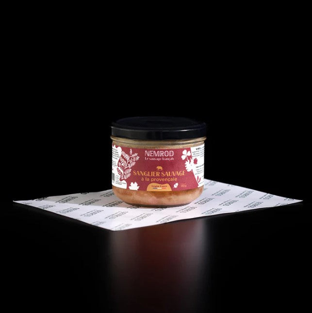 Un mélange de viande de sanglier et de légumes, comme les tomates, les oignons et les poivrons, le tout assaisonné avec des herbes de Provence. Cette recette traditionnelle de la région de Provence offre un goût robuste et savoureux à notre terrine. C'est une façon délicieuse de consommer du gibier.